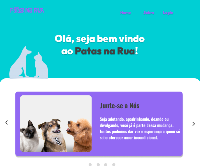 Patas da Rua é um site focado à proteger e melhorar a qualidade de vida de animais de rua, oferecendo uma solução tecnológica usando coleiras rastreadoras que permitem monitorar esses animais em tempo real. O rastreamento permite que a ONG acompanhe o animal e organize apadrinhamentos e adoções.