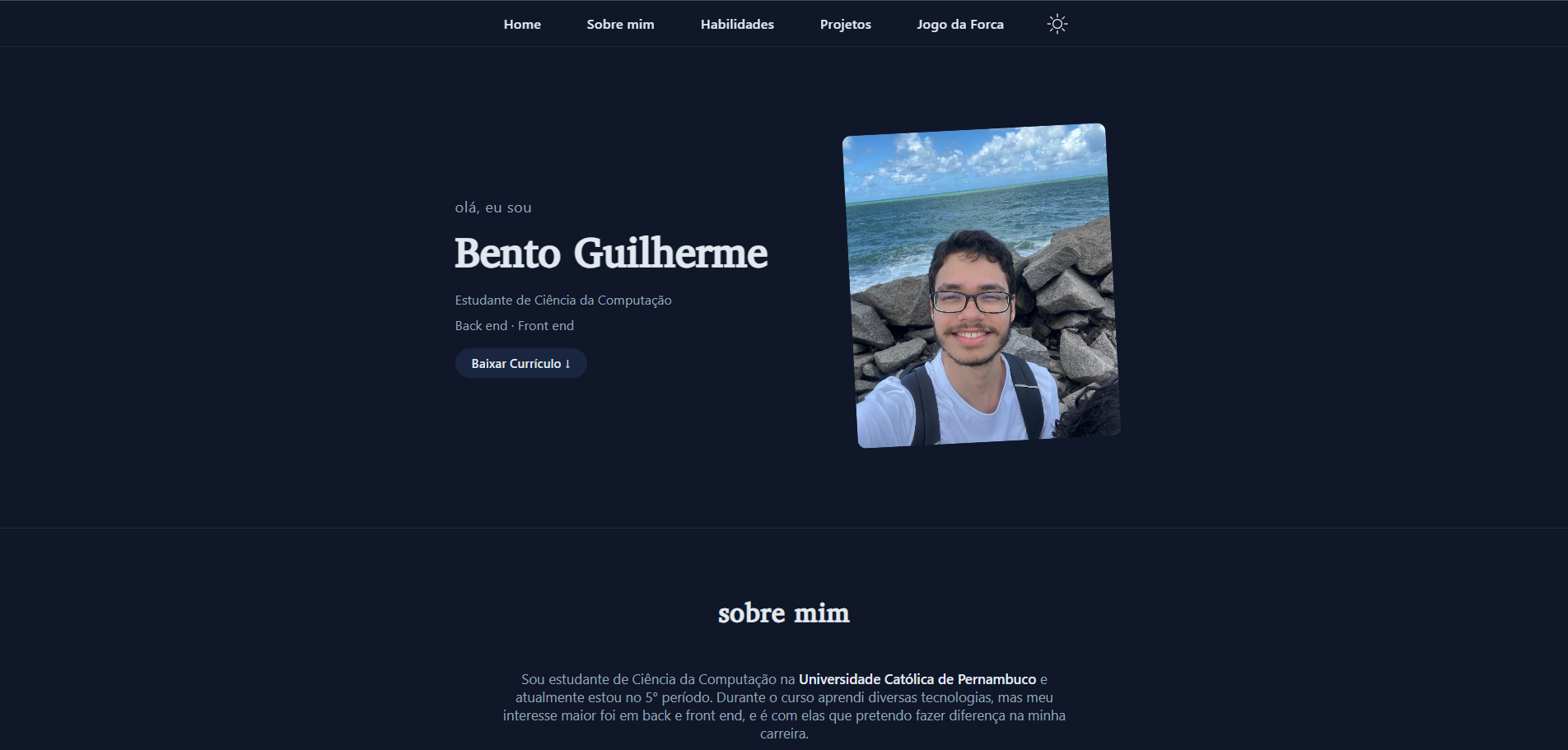 Portfólio pessoal criado para reunir minhas informações, projetos, contato e jogo da forca, ao mesmo tempo em que serve como um aprimoramento para minhas habilidades em desenvolvimento front-end com React e CSS.